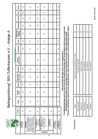Beitragsordnung* SSV Zuffenhausen e.V. - Anlage A *Alle genannten Betr%u00e4ge sind in Euro ausgewiesen ** Ein Mitgliedsbeitrag setzt sich immer aus dem Hauptvereinsbeitrag zzgl. der gew%u00e4hlten Abteilung/-en zusammen. Eine Mitgliedschaft besteht also mindestens aus dem Hauptverein und einer Abteilungszugeh%u00f6rigkeit. ***Kinder/ Jugendliche d%u00fcrfen bei einer Mitgliedschaft in dieser Abteilung flexibel in allen Abteilungen Sport treiben. 6WDQGffl%u0003%u0013%u0014%u0011%u0013%u0014%u0011%u0015%u0013%u0015%u0019%u0003Abteilungsbeitr%u00e4ge** B%u00e4dle Freizeit- sport Fu%u00dfball Gesundheit/ Pr%u00e4vention Handball Kinder-/ Jugendsport*** Schwimmen Karate Taekwondo Freestyle/ Tricking Volleyball Pickleball Rad Schach 85 80 110 210 100 * 120 110 110 90 80 80 40 55 40 75 170 60 * 75 70 70 60 60 40 20 55 40 70 170 55 90 75 55 55 60 60 40 25 25 25 40 120 30 70 35 30 30 35 35 25 25 * * * * * * * * * * * * * * * * * * * * * * * * * * 40 40 40 40 40 40 40 40 40 40 40 40 40 Haupt- verein** A-Mitglied Erwachsene 60 B-Mitglied Erwachsene mit Erm%u00e4%u00dfigung (Partner eines A-Mitglieds mit gleicher Wohnadresse und Kontoverbindung; Sch%u00fcler, Studenten, Azubis bis zum 27. Lebensjahr mit schriftl. Nachweis) 50 C-Mitglied C1-Mitglied Kein Elternteil ist Vereinsmitglied 50 C2-Mitglied Mindestens ein Elternteil ist Vereinsmitglied. Gilt f%u00fcr das 1. & 2. Kind 40 C2-Mitglied ab dem 3. Kind 35 D-Mitglied Ehrenmitglieder * E-Mitglieder Passive Mitgliedschaft 10 Sonderbeitr%u00e4ge%u0357 Karate Beachpauschale Kinderturnen Rope Skipping Capoeira Kickboxen Training Kinder und Jugendliche bis 18 Jahre 30 Freizeitsport Volleyballer 20 Kinder 2-12 Jahre 50 Alle Teilnehmer 35 Alle Teilnehmer 50 Alle Teilnehmer 50 13