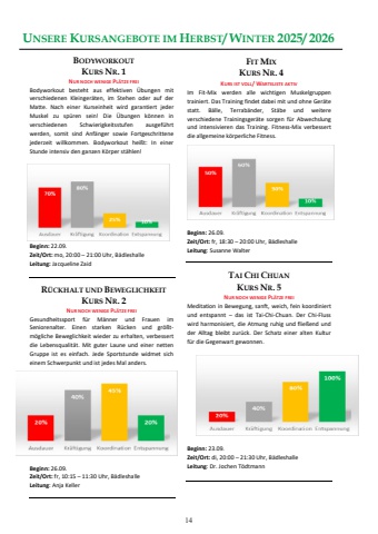 14UNSERE KURSANGEBOTE IM HERBST/ WINTER 2025/ 2026 BODYWORKOUTKURS NR. 1 NUR NOCH WENIGE PL%u00c4TZE FREIBodyworkout besteht aus effektiven %u00dcbungen mit verschiedenen Kleinger%u00e4ten, im Stehen oder auf der Matte. Nach einer Kurseinheit wird garantiert jeder Muskel zu sp%u00fcren sein! Die %u00dcbungen k%u00f6nnen in verschiedenen Schwierigkeitsstufen ausgef%u00fchrt werden, somit sind Anf%u00e4nger sowie Fortgeschrittene jederzeit willkommen. Bodyworkout hei%u00dft: In einer Stunde intensiv den ganzen K%u00f6rper st%u00e4hlen! Beginn: 22.09. Zeit/Ort: mo, 20:00 %u2013 21:00 Uhr, B%u00e4dleshalle Leitung: Jacqueline Zaid R%u00dcCKHALT UND BEWEGLICHKEITKURS NR. 2 NUR NOCH WENIGE PL%u00c4TZE FREIGesundheitssport f%u00fcr M%u00e4nner und Frauen im Seniorenalter. Einen starken R%u00fccken und gr%u00f6%u00dftm%u00f6gliche Beweglichkeit wieder zu erhalten, verbessert die Lebensqualit%u00e4t. Mit guter Laune und einer netten Gruppe ist es einfach. Jede Sportstunde widmet sich einem Schwerpunkt und ist jedes Mal anders. Beginn: 26.09. Zeit/Ort: fr, 10:15 %u2013 11:30 Uhr, B%u00e4dleshalle Leitung: Anja Keller FIT MIXKURS NR. 4 KURS IST VOLL/ WARTELISTE AKTIVIm Fit-Mix werden alle wichtigen Muskelgruppen trainiert. Das Training findet dabei mit und ohne Ger%u00e4te statt. B%u00e4lle, Terrab%u00e4nder, St%u00e4be und weitere verschiedene Trainingsger%u00e4te sorgen f%u00fcr Abwechslung und intensivieren das Training. Fitness-Mix verbessert die allgemeine k%u00f6rperliche Fitness. Beginn: 26.09. Zeit/Ort: fr, 18:30 %u2013 20:00 Uhr, B%u00e4dleshalle Leitung: Susanne Walter TAI CHI CHUANKURS NR. 5 NUR NOCH WENIGE PL%u00c4TZE FREIMeditation in Bewegung, sanft, weich, fein koordiniert und entspannt %u2013 das ist Tai-Chi-Chuan. Der Chi-Fluss wird harmonisiert, die Atmung ruhig und flie%u00dfend und der Alltag bleibt zur%u00fcck. Der Schatz einer alten Kultur f%u00fcr die Gegenwart gewonnen. Beginn: 23.09. Zeit/Ort: di, 20:00 %u2013 21:30 Uhr, B%u00e4dleshalle Leitung: Dr. Jochen T%u00f6dtmann