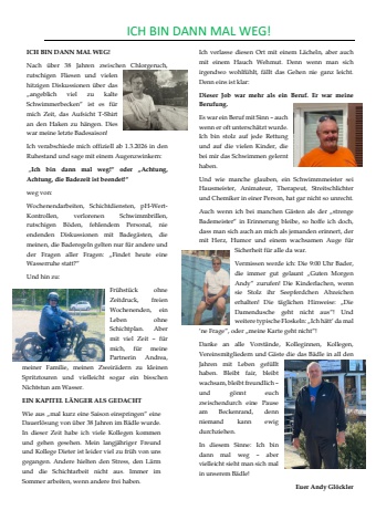 ICH BIN DANN MAL WEG! ICH BIN DANN MAL WEG! Nach %u00fcber 38 Jahren zwischen Chlorgeruch, rutschigen Fliesen und vielen hitzigen Diskussionen %u00fcber das %u201eangeblich viel zu kalte Schwimmerbecken%u201c ist es f%u00fcr mich Zeit, das Aufsicht T-Shirt an den Haken zu h%u00e4ngen. Dies war meine letzte Badesaison! Ich verabschiede mich offiziell ab 1.3.2026 in den Ruhestand und sage mit einem Augenzwinkern: %u201eIch bin dann mal weg!%u201c oder %u201eAchtung, Achtung, die Badezeit ist beendet!%u201c weg von: Wochenendarbeiten, Schichtdiensten, pH-WertKontrollen, verlorenen Schwimmbrillen, rutschigen B%u00f6den, fehlendem Personal, nie endenden Diskussionen mit Badeg%u00e4sten, die meinen, die Baderegeln gelten nur f%u00fcr andere und der Fragen aller Fragen: %u201eFindet heute eine Wasserruhe statt?%u201c Und hin zu: Fr%u00fchst%u00fcck ohne Zeitdruck, freien Wochenenden, ein Leben ohne Schichtplan. Aber mit viel Zeit %u2013 f%u00fcr mich, f%u00fcr meine Partnerin Andrea, meiner Familie, meinen Zweir%u00e4dern zu kleinen Spritztouren und vielleicht sogar ein bisschen Nichtstun am Wasser. EIN KAPITEL L%u00c4NGER ALS GEDACHT Wie aus %u201emal kurz eine Saison einspringen%u201c eine Dauerl%u00f6sung von %u00fcber 38 Jahren im B%u00e4dle wurde. In dieser Zeit habe ich viele Kollegen kommen und gehen gesehen. Mein langj%u00e4hriger Freund und Kollege Dieter ist leider viel zu fr%u00fch von uns gegangen. Andere hielten den Stress, den L%u00e4rm und die Schichtarbeit nicht aus. Immer im Sommer arbeiten, wenn andere frei haben. Ich verlasse diesen Ort mit einem L%u00e4cheln, aber auch mit einem Hauch Wehmut. Denn wenn man sich irgendwo wohlf%u00fchlt, f%u00e4llt das Gehen nie ganz leicht. Denn eins ist klar: Dieser Job war mehr als ein Beruf. Er war meine Berufung. Es war ein Beruf mit Sinn %u2013 auch wenn er oft untersch%u00e4tzt wurde. Ich bin stolz auf jede Rettung und auf die vielen Kinder, die bei mir das Schwimmen gelernt haben. Und wie manche glauben, ein Schwimmmeister sei Hausmeister, Animateur, Therapeut, Streitschlichter und Chemiker in einer Person, hat gar nicht so unrecht. Auch wenn ich bei manchen G%u00e4sten als der %u201estrenge Bademeister%u201c in Erinnerung bleibe, so hoffe ich doch, dass man sich auch an mich als jemanden erinnert, der mit Herz, Humor und einem wachsamen Auge f%u00fcr Sicherheit f%u00fcr alle da war. Vermissen werde ich: Die 9:00 Uhr Bader, die immer gut gelaunt %u201eGuten Morgen Andy%u201c zurufen! Die Kinderlachen, wenn sie Stolz ihr Seepferdchen Abzeichen erhalten! Die t%u00e4glichen Hinweise: %u201eDie Damendusche geht nicht aus%u201c! Und weitere typische Floskeln: %u201eIch h%u00e4tt%u2018 da mal %u2018ne Frage%u201c, oder %u201emeine Karte geht nicht%u201c! Danke an alle Vorst%u00e4nde, Kolleginnen, Kollegen, Vereinsmitgliedern und G%u00e4ste die das B%u00e4dle in all den Jahren mit Leben gef%u00fcllt haben. Bleibt fair, bleibt wachsam, bleibt freundlich %u2013 und g%u00f6nnt euch zwischendurch eine Pause am Beckenrand, denn niemand kann ewig durchziehen. In diesem Sinne: Ich bin dann mal weg %u2013 aber vielleicht sieht man sich mal in unserem B%u00e4dle! Euer Andy Gl%u00f6ckler