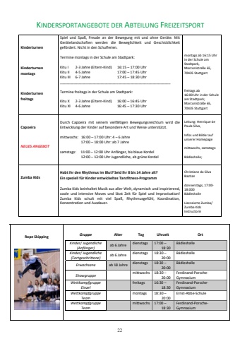 22Rope Skipping Gruppe Alter Tag Uhrzeit Ort Kinder/ Jugendliche (Anf%u00e4nger) ab 6 Jahre dienstags 17:00 %u2013 18:30 B%u00e4dleshalle Kinder/ Jugendliche (Fortgeschrittene) ab 6 Jahre dienstags 18:30 %u2013 20:00 B%u00e4dleshalle Erwachsene ab 18 Jahre dienstags 18:30 %u2013 20:00 B%u00e4dleshalle Showgruppe mittwochs 18:30 %u2013 20:00 Ferdinand-PorscheGymnasium Wettkampfgruppe Einzel freitags 16:30 %u2013 18:30 Ferdinand-PorscheGymnasium Wettkampfgruppe Team montags 18:30 %u2013 20:00 Ernst-Abbe-Schule Wettkampfgruppe Team mittwochs 17:00 %u2013 18:30 Ferdinand-PorscheGymnasium KinderturnenKinderturnen montags Kinderturnen freitags Spiel und Spa%u00df, Freude an der Bewegung mit und ohne Ger%u00e4te. MitGer%u00e4telandschaften werden die Beweglichkeit und Geschicklichkeit gef%u00f6rdert. Nicht in den Schulferien. Termine montags in der Schule am Stadtpark: Kitu I 2-3 Jahre (Eltern-Kind) 16:15 %u2013 17:00 Uhr Kitu II 4-5 Jahre 17:00 %u2013 17:45 Uhr Kitu III 6-7 Jahre 17:45 %u2013 18:30 Uhr _______________________________________________________ Termine freitags in der Schule am Stadtpark: Kitu X 2-3 Jahre (Eltern-Kind) 16:00 %u2013 16:45 Uhr Kitu XI 4-6 Jahre 16:45 %u2013 17:30 Uhr montags ab 16:15 Uhr in der Schule am Stadtpark, Marconistra%u00dfe 65, 70435 Stuttgart freitags ab 16:00 Uhr in der Schule am Stadtpark; Marconistra%u00dfe 65, 70435 StuttgartCapoeira NEUES ANGEBOTDurch Capoeira mit seinem vielf%u00e4ltigen Bewegungsreichtum wird die Entwicklung der Kinder auf besondere Art und Weise unterst%u00fctzt. mittwochs: 16:00 %u2013 17:00 Uhr: 4 %u2013 6 Jahre 17:00 %u2013 18:00 Uhr: ab 7 Jahre samstags: 11:00 %u2013 12:00 Uhr Anf%u00e4nger, bis blaue Kordel 12:00 %u2013 13:00 Uhr Jugendliche, ab gr%u00fcne Kordel Leitung: Henrique de Paula Silva, Infos und Bilder auf unserer Homepage mittwochs, samstags: B%u00e4dleshalle; Zumba KidsHabt ihr den Rhythmus im Blut? Seid ihr 8 bis 14 Jahre alt? Ein speziell f%u00fcr Kinder entwickeltes Tanzfitness-Programm Zumba Kids beinhaltet Musik aus aller Welt, dynamisch und inspirierend, coole und intensive Moves und l%u00e4sst Zeit f%u00fcr Spiel und Improvisation! Zumba Kids schult mit viel Spa%u00df, Rhythmusgef%u00fchl, Koordination, Konzentration und Ausdauer. Christiane da Silva Bastian donnerstags, 17:00-18:000 B%u00e4dleshalle Lizenzierte Zumba/ Zumba Kids Instructorin KINDERSPORTANGEBOTE DER ABTEILUNG FREIZEITSPORT