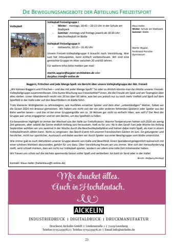 Volleyball Volleyball Freizeitgruppe I - Winter: montags, 18:45 %u2013 20:15 Uhr in der Schule am Stadtpark - Sommer: montags und freitags jeweils ab 18:30 Uhr: Beachvolleyball im B%u00e4dle Volleyball Freizeitgruppe II - mittwochs, 20:15 %u2013 21:45 Uhr Unsere Freizeit-Volleyballgruppe II braucht noch Verst%u00e4rkung. Wer Lust hat mitzuspielen, kann einfach vorbeischauen. Wir sind eine gemischte Gruppe im Alter zwischen 20 und 60 Jahren. F%u00fcr weitere Infos bitte melden per mail: martin.wypior@wypior-architekten.de oder ducphuc.tran@t-online.deKlaus Haller, Winter: Schule am Stadtpark Sommer: B%u00e4dle Martin Wypior, Ferdinand-PorscheGymnasium Baggern, Pritschen und jede Menge Spa%u00df: ein Bericht %u00fcber unsere Volleyballgruppe der Abt. Freizeit %u201eWir k%u00f6nnen Baggern und Pritschen %u2013 und das mit jeder Menge Spa%u00df!%u201c So oder so %u00e4hnlich k%u00f6nnte man das Motto unserer FreizeitVolleyballgruppe zusammenfassen. Eine bunte Mischung aus Freizeitathlet*innen, die die Freude am Spiel und am Teamgeist %u00fcber alles stellen. Unser Altersbereich reicht von 20 bis %u00fcber 60 Jahre, was bei uns jedoch nur zu noch mehr Vielfalt und Spa%u00df auf dem Spielfeld in der Halle oder auf den Beachfeldern im B%u00e4dle f%u00fchrt. Trotz kleinerer Widrigkeiten zu Jahresbeginn, wie Ausf%u00e4llen einzelner Spieler und dem eher %u201eunbest%u00e4ndigen%u201c Wetter, haben wir die Saison 2024 mit Bravour gemeistert. Wir haben uns nicht von der ein oder anderen fehlenden Spielerin oder Spieler aus der Bahn werfen lassen %u2013 und das ist bei einer Gruppengr%u00f6%u00dfe von ca. 14 Aktiven gar nicht so einfach! Aber, was soll's? Der Rest der Gruppe war umso engagierter und tat sein Bestes, um das Spielfeld zu f%u00fcllen. Ein besonderes Highlight ist immer der Wechsel von der Halle zur Freiluftsaison. Warme Temperaturen hatten sich 2024 ein wenigZeit gelassen, aber sobald die Sonne endlich Anfang Juni herauskam, hie%u00df es f%u00fcr uns: Ab in den Sand! Fast jede Woche bis Anfang September w%u00fchlten wir uns zweimal in der Woche durch die Beachvolleyballpl%u00e4tze und hatten dabei mehr Spa%u00df, als man in einem Volleyballmatch z%u00e4hlen kann. Nicht zu vergessen: das Beach-Event mit unseren franz%u00f6sischen G%u00e4sten im Juni. Ein gelungener und herzlicher, nicht nur sportlicher, Austausch und dabei wurden wir durch Spieler aus einer Beachgruppe vom B%u00e4dle unterst%u00fctzt. Wie immer gab es auch Aktivit%u00e4ten unserer Gruppe abseits von Halle und Beachfeld. Einen Spielabend gelegentlich kulinarisch mit einer sch%u00f6nen Mahlzeit abzurunden, geh%u00f6rt f%u00fcr uns dazu. %u00dcber Verst%u00e4rkung freuen wir uns immer. Wer sich der Herausforderung stellt, wird schnell merken, dass wir nicht nur Volleyball spielen, sondern vor allem eine tolle Zeit miteinander haben. Wir freuen uns schon auf die n%u00e4chste spannende Saison voller Spa%u00df und verbleiben: bis bald im Sand oder in der Halle! Bericht: Wolfgang Breitkopf Kontakt: Klaus Haller (hallerklaus@t-online.de) DIE BEWEGUNGSANGEBOTE DER ABTEILUNG FREIZEITSPORTINDUSTRIEDRUCK I DIGITALDRUCK I DRUCKMANUFAKTURDruckerei Aickelin GmbH I Lindenstra%u00dfe 1 I 71229 LeonbergTelefon 07152.93978.0 I Telefax 07152.93978.20 I Email info@aickelin.deI I I II IINDUSTRIEDRUCK I DIGITALDRUCK I DRUCKMANUFAKTURDruckerei Aickelin GmbH I Lindenstra%u00dfe 1 I 71229 LeonbergTelefon 07152.93978.0 I Telefax 07152.93978.20 I Email info@aickelin.deI I I II IAnzeigeDruckerei AickelinAuch in Hochdeutsch.Druckerei AickelinAnzeige3Mir drucket %u00e4lles.Auch in Hochdeutsch.323