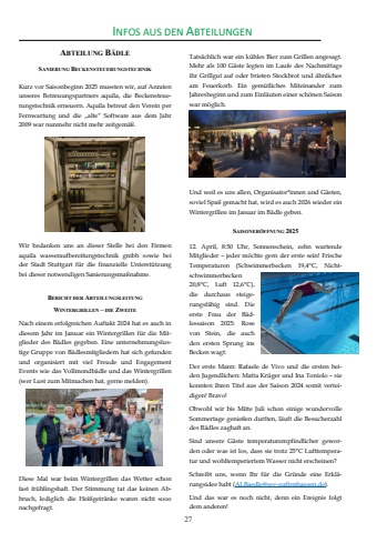 27INFOS AUS DEN ABTEILUNGENABTEILUNG B%u00c4DLESANIERUNG BECKENSTEUERUNGSTECHNIKKurz vor Saisonbeginn 2025 mussten wir, auf Anraten unseres Betreuungspartners aquila, die Beckensteuerungstechnik erneuern. Aquila betreut den Verein per Fernwartung und die %u201ealte%u201c Software aus dem Jahr 2009 war nunmehr nicht mehr zeitgem%u00e4%u00df. Wir bedanken uns an dieser Stelle bei den Firmen aquila wasseraufbereitungstechnik gmbh sowie bei der Stadt Stuttgart f%u00fcr die finanzielle Unterst%u00fctzung bei dieser notwendigen Sanierungsma%u00dfnahme. BERICHT DER ABTEILUNGSLEITUNGWINTERGRILLEN %u2013 DIE ZWEITENach einem erfolgreichen Auftakt 2024 hat es auch in diesem Jahr im Januar ein Wintergrillen f%u00fcr die Mitglieder des B%u00e4dles gegeben. Eine unternehmungslustige Gruppe von B%u00e4dlesmitgliedern hat sich gefunden und organisiert mit viel Freude und Engagement Events wie das Vollmondb%u00e4dle und das Wintergrillen (wer Lust zum Mitmachen hat, gerne melden). Diese Mal war beim Wintergrillen das Wetter schon fast fr%u00fchlingshaft. Der Stimmung tat das keinen Abbruch, lediglich die Hei%u00dfgetr%u00e4nke waren nicht sooo nachgefragt. Tats%u00e4chlich war ein k%u00fchles Bier zum Grillen angesagt. Mehr als 100 G%u00e4ste legten im Laufe des Nachmittags ihr Grillgut auf oder brieten Stockbrot und %u00e4hnliches am Feuerkorb. Ein gem%u00fctliches Miteinander zum Jahresbeginn und zum Einl%u00e4uten einer sch%u00f6nen Saison war m%u00f6glich. Und weil es uns allen, Organisator*innen und G%u00e4sten, soviel Spa%u00df gemacht hat, wird es auch 2026 wieder ein Wintergrillen im Januar im B%u00e4dle geben. SAISONER%u00d6FFNUNG 2025 12. April, 8:50 Uhr, Sonnenschein, zehn wartende Mitglieder %u2013 jeder m%u00f6chte gern der erste sein! Frische Temperaturen (Schwimmerbecken 19,4%u00b0C, Nichtschwimmerbecken 20,8%u00b0C, Luft 12,6%u00b0C), die durchaus steigerungsf%u00e4hig sind. Die erste Frau der B%u00e4dlessaison 2025: Rose von Stein, die auch den ersten Sprung ins Becken wagt: Der erste Mann: Rafaele de Vivo und die ersten beiden Jugendlichen: Matta Kr%u00fcger und Ina Toniolo %u2013 sie konnten ihren Titel aus der Saison 2024 somit verteidigen! Bravo! Obwohl wir bis Mitte Juli schon einige wundervolle Sommertage genie%u00dfen durften, l%u00e4uft die Besucherzahl des B%u00e4dles zaghaft an. Sind unsere G%u00e4ste temperaturempfindlicher geworden oder was ist los, dass sie trotz 25%u00b0C Lufttemperatur und wohltemperiertem Wasser nicht erscheinen? Schreibt uns, wenn Ihr f%u00fcr die Gr%u00fcnde eine Erkl%u00e4rungsidee habt (ALBaedle@ssv-zuffenhausen.de). Und das war es noch nicht, denn ein Ereignis folgt dem anderen!