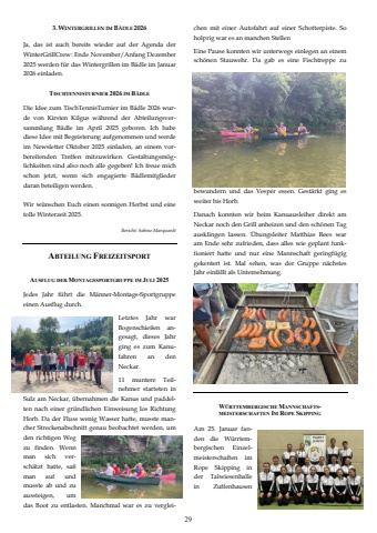 29chen mit einer Autofahrt auf einer Schotterpiste. So holprig war es an manchen Stellen Eine Pause konnten wir unterwegs einlegen an einem sch%u00f6nen Stauwehr. Da gab es eine Fischtreppe zu bewundern und das Vesper essen. Gest%u00e4rkt ging es weiter bis Horb. Danach konnten wir beim Kanuausleiher direkt am Neckar noch den Grill anheizen und den sch%u00f6nen Tag ausklingen lassen. %u00dcbungsleiter Matthias Rees war am Ende sehr zufrieden, dass alles wie geplant funktioniert hatte und nur eine Mannschaft geringf%u00fcgig gekentert ist. Mal sehen, was der Gruppe n%u00e4chstes Jahr einf%u00e4llt als Unternehmung. W%u00dcRTTEMBERGISCHE MANNSCHAFTSMEISTERSCHAFTEN IM ROPE SKIPPINGAm 25. Januar fanden die W%u00fcrrtembergischen Einzelmeisterschaften im Rope Skipping in der Talwiesenhalle in Zuffenhausen ABTEILUNG FREIZEITSPORTAUSFLUG DER MONTAGSSPORTGRUPPE IM JULI 2025 Jedes Jahr f%u00fchrt die M%u00e4nner-Montags-Sportgruppe einen Ausflug durch. Letztes Jahr war Bogenschie%u00dfen angesagt, dieses Jahr ging es zum Kanufahren an den Neckar. 11 muntere Teilnehmer starteten in Sulz am Neckar, %u00fcbernahmen die Kanus und paddelten nach einer gr%u00fcndlichen Einweisung los Richtung Horb. Da der Fluss wenig Wasser hatte, musste mancher Streckenabschnitt genau beobachtet werden, um den richtigen Weg zu finden. Wenn man sich versch%u00e4tzt hatte, sa%u00df man auf und musste ab und zu aussteigen, um das Boot zu entlasten. Manchmal war es zu verglei3. WINTERGRILLEN IM B%u00c4DLE 2026 Ja, das ist auch bereits wieder auf der Agenda der WinterGrillCre Ende November/Anfang Dezember 2025 werden f%u00fcr das Wintergrillen im B%u00e4dle im Januar 2026 einladen. TISCHTENNISTURNIER 2026 IM B%u00c4DLEDie Idee zum TischTennisTurnier im B%u00e4dle 2026 wurde von Kirsten Kilgus w%u00e4hrend der Abteilungsversammlung B%u00e4dle im April 2025 geboren. Ich habe diese Idee mit Begeisterung aufgenommen und werde im Newsletter Oktober 2025 einladen, an einem vorbereitenden Treffen mitzuwirken. Gestaltungsm%u00f6glichkeiten sind also noch alle gegeben! Ich freue mich schon jetzt, wenn sich engagierte B%u00e4dlemitglieder daran beteiligen werden. Wir w%u00fcnschen Euch einen sonnigen Herbst und eine tolle Winterzeit 2025. Bericht: Sabine Marquardt