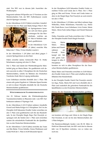 W%u00dcRTTEMBERGISCHE TEAMMEISTERSCHAFTENAm 23. Februar fanden die W%u00fcrttembergischen Teammeisterschaften in Blaustein statt. vom SSV Zuffenhausen nahmen 17 Springer Teil. In der Altersklasse 4 (12-13 Jahre) nahmen Annabelle Grund und Matta Kr%u00fcger in 2 Disziplinen Teil. In der Disziplin 2x30 Sekunden Double Under erreichten sie den 3. Platz und qualifizierten sich f%u00fcr das Bundesfinale. In der Disziplin Single Rope Pair Freestyle ersprangen sich die beiden den 1. Platz und erreichten zudem die erforderliche Punktzahl f%u00fcr die Qualifikation zu den Deutschen Meisterschaften. In der Altersklasse 3 (14-15 Jahre) erreichte das Team um Mia Bahat, Vivien Scheller, Fenna Wie%u00dfmann und Linda Wolf der 1. Platz in 4x30 Sekunden Speed. statt. Der SSV war in diesem Jahr Ausrichter des Wettkampfes. Insgesamt nahmen 90 Sportler aus 13 Vereinen an den Meisterschaften Teil, der SSV Zuffenhausen wurde durch 8 Springer vertreten. In der Altersklasse 4 (12-13 Jahre) erreichten Annabelle Grund den 16. Platz und Matta Kr%u00fcger Platz 8. Beide Springerinnen konnten sich mit ihren guten Leistungen f%u00fcr das Bundesfinale, welches am 03. Mai in Seeheim stattfand, qualifizieren. In der Altersklasse 3 (14-15 Jahre) erreichte Mia Bahat den 7. Platz, Vivien Scheller wurde 6. In der Altersklasse 1 (19 Jahre und %u00e4lter) gingen 3 unserer Springerinnen an den Start. Dabei erreichte Janina Gr%u00f6nwoldt Platz 12. Heike Sickelmann ersprang sich den 11. Platz. Der 1. Platz und damit der W%u00fcrttembergische Meistertitel ging an Maria Maier. Sie qualifizierte sich damit souver%u00e4n in allen 3 Disziplinen f%u00fcr die Deutschen Meisterschaften, welche im Rahmen des Deutschen Turnfestes Ende Mai in Leipzig stattfanden. Leon Unbehaun erreichte ebenfalls den 1. Platz. Mit einem sehr guten Ergebnis in 3 Minuten Speed konnte er sich in dieser Disziplin ebenfalls f%u00fcr die Deutsche Meisterschaften qualifizieren. In der Disziplinen 2x30 Sekunden Double Under erreichten Vivien und Linda den 4. Platz. Der 1. Platz ging an Mia und Fenna. Vivien und Linda traten zu dem in der Single Rope Pair Freestyle an und erreichten den 3. Platz. In der Altersklasse 1 (19 Jahre und %u00e4lter) nahmen Inga Wiltschko, Heike Sickelmann, Franziska Loy, Maria Erb, Paula Bosse, Leon Unbehaun, Livia Vonier, Maria Maier, Alicia Fusil, Julian Kilgus und Daniel Stannard teil. Heike, Franziska und Paula erreichten den 3. Platz in der Disziplin Double Dutch Single Freestyle. Livia, Maria Maier, Alicia, Julian und Daniel nahmen am Overall Wettkampf teil. Mit sehr guten Leistungen in allen 8 Disziplinen konnten sie sich in allen Disziplinen f%u00fcr die Deutschen Meisterschaften qualifizieren. Maria Maier und Franziska erreichten in 2x30 Sekunden Double Under den 2. Platz und schafften die Qualifikation f%u00fcrs Bundesfinale. In der Disziplin Double Dutch Pair Freestyle erreichten Inga, Paula, Maria Erb und Leon ebenfalls den 2. Platz und zus%u00e4tzlich die geforderte Punktzahl f%u00fcr die Qualifikation zu den Deutschen Meisterschaften. Ebenso f%u00fcr die Deutschen Meisterschaften qualifizieren konnten sich Inga und Alicia in der Single Rope Pair Freestyle, in der sie bei den Meisterschaften der 1.Platz belegten. Die Bundeswettk%u00e4mpfe fanden vom 28.-30. M%u00e4rz in F%u00fcrth im Odenwald statt, der SSV wird dort in diesem Jahr von 12 Sportlern vertreten, von so vielen wie noch nie. 30
