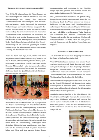 31Auch das Team von Inga, Leon, Maria und Paula zeigte einen beeindruckenden Wettkampf. Obwohl sie erst in diesem Jahr zusammengefunden haben, qualifizierten sie sich direkt im Double Dutch Pair f%u00fcr die Deutsche Meisterschaft %u2013 eine der anspruchsvollsten Disziplinen. Dort erk%u00e4mpften sie sich die Bronzemedaille und damit die Qualifikation f%u00fcr die Weltmeisterschaft in Japan im August. Das Team aus Alicia, Daniel, Julian, Livia, Maria und Steven nahm am Showwettkampf mit Springerinnen aus Wacker Neutraublingen teil. Ihre atemberaubende Show wurde von der Wettkampfleitung, sowie dem Publikum in h%u00f6chsten T%u00f6nen gelobt. Hier konnten sie sich den zweiten Platz erspringen. Au%u00dferdem waren sie in allen acht Disziplinen f%u00fcr die Deutsche Meisterschaft qualifiziert. Am Ende des Wettkampfs standen sie ganz oben auf dem Podest: Sie sicherten sich den ersten Platz im Gesamtranking, verteidigten ihren deutschen Meistertitel und qualifizierten sich ebenfalls f%u00fcr die Weltmeisterschaft in Japan. Zus%u00e4tzlich haben sich Alicia und Inga aus den beiden Teams DEUTSCHE MANNSCHAFTSMEISTERSCHAFTEN 2025 Vom 29. bis 31. M%u00e4rz nahmen die Planet Jumpers an drei Wettk%u00e4mpfen in F%u00fcrth im Odenwald teil: dem Showwettkampf am Freitag, den Deutschen Teammeisterschaften am Samstag und dem Bundesfinale am Sonntag. Hierbei haben sich die intensiven Vorbereitungen der letzten Monate ausgezahlt. Besonders hervorzuheben ist unser Nachwuchs Matta und Annabel, die zum ersten Mal an den Deutschen Teammeisterschaften teilnahmen. Sie erreichten im Pair Freestyle trotz gro%u00dfer Konkurrenz den 8. Platz und konnten sich am Sonntag in der Disziplin Double Under Single Rope, bei der m%u00f6glichst viele Doppeldurchschl%u00e4ge in 30 Sekunden gesprungen werden m%u00fcssen, sogar die Silbermedaille sichern. Eine starke Leistung, auf die wir sehr stolz sind. zusammengetan und gemeinsam in der Disziplin Single Rope Pair gestartet. Hier konnten sie sich mit einer starken Leistung den 11. Platz sichern. Die Qualifikation f%u00fcr die WM ist ein gro%u00dfer Erfolg, bringt aber auch hohe Kosten mit sich. Trotz der Unterst%u00fctzung durch den Verein m%u00fcssen wir einen erheblichen Teil der Reise- und Teilnahmegeb%u00fchren selbst tragen. Wer uns auf dem Weg zur Weltmeisterschaft unterst%u00fctzen m%u00f6chte, kann dies mit einer Spende tun %u2013 jede Hilfe ist willkommen. Vielen Dank an alle Athletinnen und Athleten, Trainerinnen und Trainer sowie an alle, die uns an diesem Wochenende unterst%u00fctzt haben. Die harte Arbeit hat sich gelohnt, und wir freuen uns auf die n%u00e4chste Herausforderung in Japan. BUNDESFINALE ROPE SKIPPING 2025 Am 03.05.2025 fand das Rope Skipping Bundefinale im Einzel in Seeheim-Jugenheim statt. Vom SSV Zuffenhausen nahmen zwei unserer Nachwuchsspringerinnen teil. Beide konnten sich durch sehr gute Leistungen an den diesj%u00e4hrigen W%u00fcrttembergischen Meisterschaften f%u00fcr diesen Wettkampf qualifizieren. Nach der Teilnahme an den Deutschen Teammeisterschaften im M%u00e4rz ist es bereits der zweite Wettkampf auf Bundesebene f%u00fcr die Beiden. Matta startete in der j%u00fcngsten Altersklasse (12-14 Jahre) im Overall Wettkampf. Mit konstant sehr guten Leistungen in 30 Sekunden Speed, 3 Minuten Speed und einem sch%u00f6nen Freestyle konnte Sie sich im guten Mittelfeld auf Platz 16 platzieren. Annabelle startete ebenfalls in der Altersklasse 4 (12-14 Jahre) in der Disziplin Freestyle. Sie konnten einen sehr guten Wettkampf abliefern und erreichte bei einem starken Teilnehmerfeld von 47 Starterinnen einen sehr guten 10. Platz. Wir sind sehr stolz auf die Beiden und freuen uns f%u00fcr Sie, dass sich das Training ausgezahlt hat.
