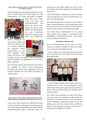 32TEILNAHME AM INTERNATIONALEN DEUTSCHEN TURNFEST 2025 IN LEIPZIGBei dem diesj%u00e4hrigen Internationalen Deutschen Turnfest in Leipzig nahmen die Rope Skipper des SSV Zuffenhausens teil. Dabei absolvierten Annabelle, Matta, Mia, Fenna, Heike, Vivien und Franzi den Turnfestwettkampf und damit den letzten Wettkampf der Saison. Dabei konnten sich mit Springern aus ganz Deutschland messen. Sie sprangen einen tollen und erfolgreichen letzten Wettkampf f%u00fcr diese Saison. Zudem sind Maria und Julian bei den am Turnfest stattfindenden Deutschen Einzelmeisterschaften an den Start gegangen. Dabei konnte sich Maria in der Disziplin Freestyle und Julian in den verschiedenen Speed Disziplinen eine Qualifikation f%u00fcr die WM in Japan erspringen. Zum Abschluss durften alle gemeinsam eine Show in der Glashalle der Messe Leipzig pr%u00e4sentieren. Wir hatten eine sch%u00f6ne und ereignisreiche Woche in Leipzig und haben uns viele weitere Sportarten anschauen d%u00fcrfen. ERFOLGREICHE TEILNAHME UNSERER ZUFFENH%u00c4USER ROPE SKIPPER BEI DER WELTMEISTERSCHAFT IN JAPANNeun unserer Rope Skipper aus Zuffenhausen haben in diesem Sommer an einem ganz besonderen sportlichen Gro%u00dfereignis teilgenommen: den Rope Skipping Weltmeisterschaften 2025 in Kawasaki, Japan. Gemeinsam mit rund 2.000 Athleten aus %u00fcber 30 L%u00e4ndern stellten sich unsere Springer der internationalen Konkurrenz. Unsere Zuffenh%u00e4user schickten zwei Teams mit insgesamt neun Sportlern, die sich im Vorfeld intensiv auf die WM vorbereitet hatten: Beim International Open Tournament, dem hochkar%u00e4tigen Vorbereitungsturnier vor der Weltmeisterschaft, hat unser Team um Alicia, Maria, Livia und Daniel im Double Dutch Pair Style die Goldmedaille geholt! Das Turnier bringt Teilnehmende aus der ganzen Welt zusammen, die knapp an der direkten WMQualifikation vorbeigeschrammt sind %u2013 umso h%u00f6her ist dieser Erfolg einzusch%u00e4tzen. Herzlichen Gl%u00fcckwunsch! Bei der Weltmeisterschaft trat das Team um Alicia, Maria, Livia, Daniel und Julian in mehreren Disziplinen an und erzielte beachtliche Erfolge: %u2022 Zwei 11. Pl%u00e4tze in der Singe Rope Pair Freestyle und in der Team Freestyle, sowie einen 14. Platz im Single Rope Speed Relay. %u2022 In der Disziplin Double Dutch Single Freestyle erreichten sie den 7. Platz %u2013 ein Top-10-Ergebnis. Leider reichte dieser Platz ganz knapp nicht f%u00fcr das Finale, in dem nur die sechs besten Teams pro Disziplin erneut antreten durften. Das zweite Team, bestehend aus Inga, Paula, Maria und Leon, trat in der Disziplin Double Dutch Pair Freestyle an. F%u00fcr dieses Team war es der erste internationale Wettkampf. Entsprechend gro%u00df war die Anspannung, aber alle vier meisterten ihren Auftritt mit Bravour und sammelten wichtige internationale Erfahrungen. Sie belegten den 21. Platz.
