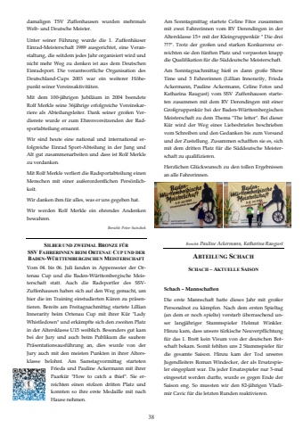 38Bericht: Pauline Ackermann, Katharina RaugustABTEILUNG SCHACHSCHACH %u2013 AKTUELLE SAISONSchach %u2013 Mannschaften Die erste Mannschaft hatte dieses Jahr mit gro%u00dfer Personalnot zu k%u00e4mpfen. Nach dem ersten Spieltag (an dem er noch spielte) verstarb %u00fcberraschend unser langj%u00e4hriger Stammspieler Helmut Winkler. Hinzu kam, dass unsere t%u00fcrkische Neuverpflichtung f%u00fcr das 1. Brett kein Visum von der deutschen Botschaft bekam. Somit fehlten uns 2 Stammspieler f%u00fcr die gesamte Saison. Hinzu kam der Tod unseres Jugendleiters Roman Windecker, der als Ersatzspieler eingeplant war. Da jeder Ersatzspieler nur 3-mal eingesetzt werden durfte, wurde es gegen Ende der Saison eng. So mussten wir den 82-j%u00e4hrigen Vladimir Cavic f%u00fcr die letzten Runden reaktivieren. Am Sonntagmittag startete Celine Fitos zusammen mit zwei Fahrerinnen vom RV Derendingen in der Altersklasse 15+ mit der Kleingruppenk%u00fcr \???\reichten sie den f%u00fcnften Platz und verpassten knapp die Qualifikation f%u00fcr die S%u00fcddeutsche Meisterschaft. Am Sonntagnachmittag hie%u00df es dann gro%u00dfe Show Time und 5 Fahrerinnen (Lillian Innerarity, Frieda Ackermann, Pauline Ackermann, Celine Fotos und Katharina Raugust) vom SSV Zuffenhausen starteten zusammen mit dem RV Derendingen mit einer Gro%u00dfgruppenk%u00fcr bei der Baden-W%u00fcrttembergischen Meisterschaft zu dem Thema \K%u00fcr wird der Weg eines Liebesbriefes beschrieben vom Schreiben und den Gedanken bis zum Versand und der Zustellung. Zusammen schafften sie es, sich mit dem dritten Platz f%u00fcr die S%u00fcddeutsche Meisterschaft zu qualifizieren. Herzlichen Gl%u00fcckwunsch zu den tollen Ergebnissen an alle Fahrerinnen. damaligen TSV Zuffenhausen wurden mehrmals Welt- und Deutsche Meister. Unter seiner F%u00fchrung wurde die 1. Zuffenh%u00e4user Einrad-Meisterschaft 1989 ausgerichtet, eine Veranstaltung, die seitdem jedes Jahr organisiert wird und nicht mehr Weg zu denken ist aus dem Deutschen Einradsport. Die verantwortliche Organisation des Deutschland-Cups 2003 war ein weiterer H%u00f6hepunkt seiner Vereinsaktivit%u00e4ten. Mit dem 100-j%u00e4hrigen Jubil%u00e4um in 2004 beendete Rolf Merkle seine 36j%u00e4hrige erfolgreiche Vereinskarriere als Abteilungsleiter. Dank seiner gro%u00dfen Verdienste wurde er zum Ehrenvorsitzenden der Radsportabteilung ernannt. Wir sind heute eine national und international erfolgreiche Einrad Sport-Abteilung in der Jung und Alt gut zusammenarbeiten und dass ist Rolf Merkle zu verdanken. Mit Rolf Merkle verliert die Radsportabteilung einen Menschen mit einer au%u00dferordentlichen Pers%u00f6nlichkeit. Wir danken ihm f%u00fcr alles, was er uns gegeben hat. Wir werden Rolf Merkle ein ehrendes Andenken bewahren. Bericht: Peter Sutschek SILBER UND ZWEIMAL BRONZE F%u00dcR SSV FAHRERINNEN BEIM ORTENAU CUP UND DER BADEN-W%u00dcRTTEMBERGISCHEN MEISTERSCHAFT Vom 04. bis 06. Juli fanden in Appenweier der Ortenau Cup und die Baden-W%u00fcrttembergische Meisterschaft statt. Auch die Radsportler des SSVZuffenhausen haben sich auf den Weg gemacht, um hier die im Training einstudierten K%u00fcren zu pr%u00e4sentieren. Bereits am Freitagnachmittag startete Lillian Innerarity beim Ortenau Cup mit ihrer K%u00fcr \Whistledown\in der Altersklasse U15 weiblich. Besonders gut kam bei der Jury und auch beim Publikum die saubere Pr%u00e4sentationsausf%u00fchrung an, dies wurde von der Jury auch mit den meisten Punkten in ihrer Altersklasse belohnt. Am Samstagvormittag starteten Frieda und Pauline Ackermann mit ihrer Paark%u00fcr \reichten einen stolzen dritten Platz und konnten so ihre erste Medaille mit nach Hause nehmen.