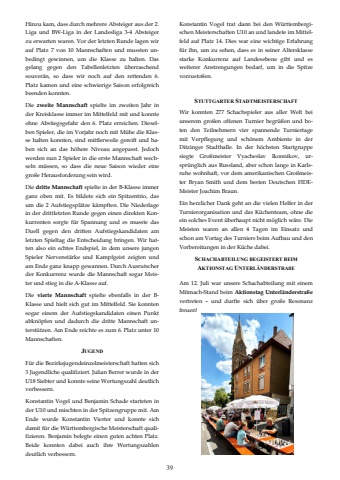 39Konstantin Vogel trat dann bei den W%u00fcrttembergischen Meisterschaften U10 an und landete im Mittelfeld auf Platz 14. Dies war eine wichtige Erfahrung f%u00fcr ihn, um zu sehen, dass es in seiner Altersklasse starke Konkurrenz auf Landesebene gibt und es weiterer Anstrengungen bedarf, um in die Spitze vorzusto%u00dfen. STUTTGARTER STADTMEISTERSCHAFTWir konnten 277 Schachspieler aus aller Welt bei unserem gro%u00dfen offenen Turnier begr%u00fc%u00dfen und boten den Teilnehmern vier spannende Turniertage mit Verpflegung und sch%u00f6nem Ambiente in der Ditzinger Stadthalle. In der h%u00f6chsten Startgruppe siegte Gro%u00dfmeister Vyacheslav Ikonnikov, urspr%u00fcnglich aus Russland, aber schon lange in Karlsruhe wohnhaft, vor dem amerikanischen Gro%u00dfmeister Bryan Smith und dem besten Deutschen FIDEMeister Joachim Braun. Ein herzlicher Dank geht an die vielen Helfer in der Turnierorganisation und das K%u00fcchenteam, ohne die ein solches Event %u00fcberhaupt nicht m%u00f6glich w%u00e4re. Die Meisten waren an allen 4 Tagen im Einsatz und schon am Vortag des Turniers beim Aufbau und den Vorbereitungen in der K%u00fcche dabei. SCHACHABTEILUNG BEGEISTERT BEIM AKTIONSTAG UNTERL%u00c4NDERSTRA%u00dfEAm 12. Juli war unsere Schachabteilung mit einem Mitmach-Stand beim Aktionstag Unterl%u00e4nderstra%u00dfevertreten %u2013 und durfte sich %u00fcber gro%u00dfe Resonanz freuen! Hinzu kam, dass durch mehrere Absteiger aus der 2. Liga und BW-Liga in der Landesliga 3-4 Absteiger zu erwarten waren. Vor der letzten Runde lagen wir auf Platz 7 von 10 Mannschaften und mussten unbedingt gewinnen, um die Klasse zu halten. Das gelang gegen den Tabellenletzten %u00fcberraschend souver%u00e4n, so dass wir noch auf den rettenden 6. Platz kamen und eine schwierige Saison erfolgreich beenden konnten. Die zweite Mannschaft spielte im zweiten Jahr in der Kreisklasse immer im Mittelfeld mit und konnte ohne Abstiegsgefahr den 6. Platz erreichen. Dieselben Spieler, die im Vorjahr noch mit M%u00fche die Klasse halten konnten, sind mittlerweile gereift und haben sich an das h%u00f6here Niveau angepasst. Jedoch werden nun 2 Spieler in die erste Mannschaft wechseln m%u00fcssen, so dass die neue Saison wieder eine gro%u00dfe Herausforderung sein wird. Die dritte Mannschaft spielte in der B-Klasse immer ganz oben mit. Es bildete sich ein Spitzentrio, das um die 2 Aufstiegspl%u00e4tze k%u00e4mpften. Die Niederlage in der drittletzten Runde gegen einen direkten Konkurrenten sorgte f%u00fcr Spannung und es musste das Duell gegen den dritten Aufstiegskandidaten am letzten Spieltag die Entscheidung bringen. Wir hatten also ein echtes Endspiel, in dem unsere jungen Spieler Nervenst%u00e4rke und Kampfgeist zeigten und am Ende ganz knapp gewannen. Durch Ausrutscher der Konkurrenz wurde die Mannschaft sogar Meister und stieg in die A-Klasse auf. Die vierte Mannschaft spielte ebenfalls in der BKlasse und hielt sich gut im Mittelfeld. Sie konnten sogar einem der Aufstiegskandidaten einen Punkt abkn%u00f6pfen und dadurch die dritte Mannschaft unterst%u00fctzen. Am Ende reichte es zum 6. Platz unter 10 Mannschaften. JUGENDF%u00fcr die Bezirksjugendeinzelmeisterschaft hatten sich 3 Jugendliche qualifiziert. Julian Berrer wurde in der U18 Siebter und konnte seine Wertungszahl deutlich verbessern. Konstantin Vogel und Benjamin Schade starteten in der U10 und mischten in der Spitzengruppe mit. Am Ende wurde Konstantin Vierter und konnte sich damit f%u00fcr die W%u00fcrttembergische Meisterschaft qualifizieren. Benjamin belegte einen guten achten Platz. Beide konnten dabei auch ihre Wertungszahlen deutlich verbessern.