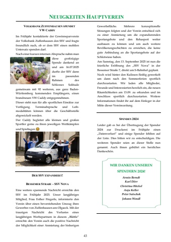 NEUIGKEITEN HAUPTVEREIN VOLKSBANK ZUFFENHAUSEN SPENDET VW CADDYIm Fr%u00fchjahr kontaktierte der Gewinnsparverein der Volksbank Zuffenhausen den SSV und fragte freundlich nach, ob er dem SSV einen mobilen Untersatz spenden darf. Nach einer kurzen internen Absprache nahm man diese gro%u00dfz%u00fcgige Spende dankend an und am 16.07.2025 durfte der SSV dann im passenden Rahmen des Schlosses Solitude gemeinsam mit 92 weiteren, aus ganz BadenW%u00fcrttemberg kommenden Empf%u00e4ngern, einen brandneuen VW Caddy entgegennehmen. Dieser steht nun f%u00fcr alle sportlichen Eins%u00e4tze zur Verf%u00fcgung. Terminabsprache und Leihmodalit%u00e4ten k%u00f6nnen %u00fcber die Gesch%u00e4ftsstelle abgewickelt werden. Der Caddy begleitet alle kleinen und gro%u00dfen Sportler gerne zu ihren jeweiligen Wettk%u00e4mpfen und Spieltagen %u09b8%u09b9%u09ba%u09bbDER SSV EXPANDIERT! BESSEMER STRA%u00dfE %u2013 SSV NOVAEine weitere spannende Nachricht erreichte den SSV im Fr%u00fchjahr 2025. Unser langj%u00e4hriges Mitglied, Frau Esther Fingerle, informierte den Verein %u00fcber einen bevorstehenden Umzug ihres Gewerbes von Zuffenhausen ans Olgaeck. Mit der traurigen Nachricht des Verlustes eines langj%u00e4hrigen Werbepartners in diesem %u201eBl%u00e4ttle%u201c erreichte den Verein auch die positive Nachricht der M%u00f6glichkeit einer Anmietung der bisherigen Gewerbefl%u00e4che. Mehrere konzeptionelle Sitzungen folgten und der Verein entschied sich zu einer Anmietung um die expandierenden Sportangebote und den Rehasport weiter ausbauen zu k%u00f6nnen und um auch weitere Bev%u00f6lkerungsschichten zu erreichen, die keine gute Anbindung an die Sportangebote auf der Schlotwiese haben.Am Samstag, den 13. September 2025 ist nun die feierliche Er%u00f6ffnung des %u201eSSV Nova%u201c in der Bessemer Stra%u00dfe 7, direkt am S-Bahnhof geplant. Noch wird hinter den Kulissen flei%u00dfig gewerkelt um dann nach den Sommerferien sportlich durchzustarten. Wir laden alle Mitglieder, Freunde und Interessierten herzlich ein, die neuen R%u00e4umlichkeiten am 13.09. zu erkunden und im Anschluss sportlich durchzustarten. Weitere Informationen findet ihr auf dem Einleger in der Mitte dieser Vereinszeitung. SPENDEN 2024 Leider gab es bei der %u00dcbertragung der Spender 2024 zur Druckerei im Fr%u00fchjahr einen %u201eDatenverlust%u201c und einige Spender fehlten auf der Liste. Dies bitten wir zu entschuldigen. Die weiteren Spender seien an dieser Stelle nun genannt. Auch ihnen geb%u00fchrt ein herzliches Dankesch%u00f6n. WIR DANKEN UNSEREN SPENDERN 2024! Armin BerndtKarl D%u00f6rr Christina H%u00f6ckel Anja Keller Peter Sutschek Johann Wendl43