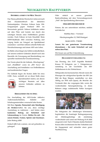NEUIGKEITEN HAUPTVEREIN DEFIBRILLATOREN UND MED. TRAGENDas Thema pl%u00f6tzlicher Herztod ist vielen erst nach dem Zusammenbruch des d%u00e4nischen Nationalspielers Christian Eriksen beim EMGruppenspiel gegen Finnland 2021 ins Bewusstsein ger%u00fcckt. Eriksen kollabierte mitten auf dem Platz und konnte nur durch den sofortigen Einsatz eines Defibrillators gerettet werden. Doch Eriksen ist kein Einzelfall. Beim DFB-Pokalfinale 2022 zwischen Freiburg und Leipzig bricht ein Fotograf am Spielfeldrand zusammen %u2013 auch hier retteten schnelle Helfer mit Herzdruckmassage und einem AED sein Leben. Im B%u00e4dle schon l%u00e4ngst eine Selbstverst%u00e4ndlichkeit, auf unseren anderen Gel%u00e4nden aktuell noch eine Baustelle: die Versorgung und Bereitstellung von spezieller medizinischer Grundausr%u00fcstung. Der Verein plant f%u00fcr die Gel%u00e4nde %u201eHirschsprung%u201c und %u201eWaldblick%u201c sowie im %u201eSSV Nova%u201c die Anschaffung und Installation von Defibrillatoren und medizinischen Tragen. Pro Gel%u00e4nde liegen die Kosten daf%u00fcr bei etwa 2.500.- Euro, weshalb wir an dieser Stelle einen Spendenaufruf starten, um diesen wichtigen Baustein auf allen unseren Gel%u00e4nden anbieten zu k%u00f6nnen. HIER KOMMEN SIE INS SPIELDie Anschaffung der AED-Ger%u00e4te inklusive Au%u00dfenwandschr%u00e4nken, Zubeh%u00f6r und Schulungsmaterialien verursacht hohe Kosten. Mit Ihrer Spende, Patenschaft oder Beteiligung als F%u00f6rderer helfen Sie uns, diese wichtige Ausstattung zu realisieren %u2013 und leisten einen konkreten Beitrag zur Sicherheit und Lebensrettung im Verein. Helfen Sie mit %u2013 f%u00fcr unsere Kinder, Trainer, Spieler und Zuschauer.Jeder Beitrag z%u00e4hlt! Einfach QR-Code scannen, um auf gofundme zu gelangen! Oder einfach an unsere gewohnte Bankverbindung mit dem Verwendungszweck %u201eDefi%u201c den Spendenbetrag %u00fcberweisen: DE64 6009 0300 0402 0100 00 Firmen, die uns unterst%u00fctzen m%u00f6chten, melden sich bitte bei: Matthias Rees %u2013 Vorstand Hirschsprungallee 12, 70435 Stuttgart Mobil: 01578 - 7745289 Lassen Sie uns gemeinsam Verantwortung %u00fcbernehmen %u2013 f%u00fcr mehr Sicherheit auf und neben dem Platz. Wir freuen uns auf Ihre Unterst%u00fctzung DELEGIERTENVERSAMMLUNGAm Dienstag, den 15.07. begr%u00fc%u00dfte Reinhold Krause 55 Delegierte zur 1. Delegiertenversammlung in der Geschichte des SSV Zuffenhausen in der Zehntscheuer. H%u00f6hepunkte des harmonischen Abends waren die Ehrungen der erfolgreichen Sportler des SSV (im Bild die Rope Skipper, unmittelbar vor dem Abflug zur WM nach Japan), die Berichte des Vorstands %u00fcber das vergangene Jahr, sowie die verabschiedete Satzungs%u00e4nderung, in deren Rahmen einige redaktionelle Fehler korrigiert wurden. Die Delegierten der Abteilungen Schwimmen begr%u00fcndeten die beantragte Beitragsanpassung der Abteilungsbeitr%u00e4ge die einstimmig verabschiedet und somit mit Wirkung 01.01.2026 umgesetzt wird. Nach 2 Stunden dankte Reinhold Krause allen erschienenen f%u00fcr ihre Teilnahme und ihr Engagement und w%u00fcnschte einen guten Nachhauseweg. 44