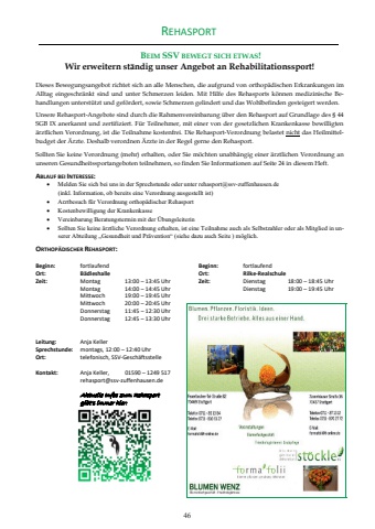 Leitung: Anja Keller Sprechstunde: montags, 12:00 %u2013 12:40 Uhr Ort: telefonisch, SSV-Gesch%u00e4ftsstelle Kontakt: Anja Keller, 01590 %u2013 1249 517 rehasport@ssv-zuffenhausen.de Aktuelle Infos zum Rehasport gibt's immer hier: ORTHOP%u00c4DISCHER REHASPORT: Beginn: fortlaufend Ort: B%u00e4dleshalle Zeit: Montag 13:00 %u2013 13:45 Uhr Montag 14:00 %u2013 14:45 Uhr Mittwoch 19:00 %u2013 19:45 Uhr Mittwoch 20:00 %u2013 20:45 Uhr Donnerstag 11:45 %u2013 12:30 Uhr Donnerstag 12:45 %u2013 13:30 Uhr Beginn: fortlaufend Ort: Rilke-Realschule Zeit: Dienstag 18:00 %u2013 18:45 Uhr Dienstag 19:00 %u2013 19:45 Uhr Aktuelle Infos zum Rehasport gibt's immer hier: ABLAUF BEI INTERESSE:%u2022 Melden Sie sich bei uns in der Sprechstunde oder unter rehasport@ssv-zuffenhausen.de (inkl. Information, ob bereits eine Verordnung ausgestellt ist)%u2022 Arztbesuch f%u00fcr Verordnung orthop%u00e4discher Rehasport %u2022 Kostenbewilligung der Krankenkasse %u2022 Vereinbarung Beratungstermin mit der %u00dcbungsleiterin %u2022 Sollten Sie keine %u00e4rztliche Verordnung erhalten, ist eine Teilnahme auch als Selbstzahler oder als Mitglied in unserer Abteilung %u201eGesundheit und Pr%u00e4vention%u201c (siehe dazu auch Seite ) m%u00f6glich. Aktuelle Infos zum Rehasport gibt's immer hier: BEIM SSV BEWEGT SICH ETWAS! Wir erweitern st%u00e4ndig unser Angebot an Rehabilitationssport! Dieses Bewegungsangebot richtet sich an alle Menschen, die aufgrund von orthop%u00e4dischen Erkrankungen im Alltag eingeschr%u00e4nkt sind und unter Schmerzen leiden. Mit Hilfe des Rehasports k%u00f6nnen medizinische Be,handlungen unterst%u00fctzt und gef%u00f6rdert, sowie Schmerzen gelindert und das Wohlbefinden gesteigert werden. Unsere Rehasport-Angebote sind durch die Rahmenvereinbarung %u00fcber den Rehasport auf Grundlage des %u00a7 44 SGB IX anerkannt und zertifiziert. F%u00fcr Teilnehmer, mit einer von der gesetzlichen Krankenkasse bewilligten %u00e4rztlichen Verordnung, ist die Teilnahme kostenfrei. Die Rehasport-Verordnung belastet nicht das Heilmittelbudget der %u00c4rzte. Deshalb verordnen %u00c4rzte in der Regel gerne den Rehasport. Sollten Sie keine Verordnung (mehr) erhalten, oder Sie m%u00f6chten unabh%u00e4ngig einer %u00e4rztlichen Verordnung an unseren Gesundheitssportangeboten teilnehmen, so finden Sie Informationen auf Seite 24 in diesem Heft. Aktuelle Infos zum Rehasport gibt's immer hier: REHASPORT Aktuelle Infos zum Rehasport gibt's immer hier: 46