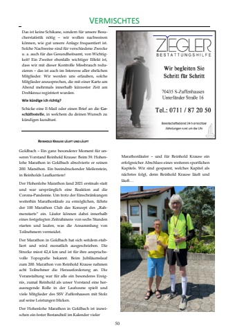 Marathonl%u00e4ufer %u2013 und f%u00fcr Reinhold Krause ein erfolgreicher Abschluss eines weiteren sportlichen Kapitels. Wir sind gespannt, welches Kapitel als n%u00e4chstes folgt, denn Reinhold Krause l%u00e4uft und l%u00e4uft%u2026 Das ist keine Schikane, sondern f%u00fcr unsere Besucherstatistik n%u00f6tig %u2013 wir wollen nachweisen k%u00f6nnen, wie gut unsere Anlage frequentiert ist. Solche Nachweise sind f%u00fcr verschiedene Zwecke u. a. auch f%u00fcr das Gesundheitsamt, von Wichtigkeit! Ein Zweiter ebenfalls wichtiger Effekt ist, dass wir mit dieser Kontrolle Missbrauch reduzieren %u2013 das ist auch im Interesse aller ehrlichen Mitglieder. Wir werden uns erlauben, solche Mitglieder anzusprechen, die mit einer Karte am Abend mehrmals innerhalb k%u00fcrzester Zeit am Drehkreuz registriert wurden. Wie k%u00fcndige ich richtig?%u0003%u0003Schicke eine E-Mail oder einen Brief an die Gesch%u00e4ftsstelle, in welchem du deinen Wunsch zu k%u00fcndigen kundtust. REINHOLD KRAUSE L%u00c4UFT UND L%u00c4UFTGoldbach %u2013 Ein ganz besonderer Moment f%u00fcr unseren Vorstand Reinhold Krause: Beim 39. Hohenlohe Marathon in Goldbach absolvierte er seinen 200. Marathon. Ein beeindruckender Meilenstein, in Reinholds Laufkarriere! Der Hohenlohe Marathon fand 2021 erstmals statt und war urspr%u00fcnglich eine Reaktion auf die Corona-Pandemie. Um trotz der Einschr%u00e4nkungen weiterhin Marathonl%u00e4ufe zu erm%u00f6glichen, f%u00fchrte der 100 Marathon Club das Konzept des %u201eRahmenstarts%u201c ein. L%u00e4ufer k%u00f6nnen dabei innerhalb eines festgelegten Zeitrahmens von sechs Stunden starten und laufen, was die Ansammlung von Teilnehmern vermeidet. Der Marathon in Goldbach hat sich seitdem etabliert und wird monatlich ausgeschrieben. Die Strecke misst 42,4 km und ist f%u00fcr ihre anspruchsvolle Topografie bekannt. Beim Jubil%u00e4umslauf zum 200. Marathon von Reinhold Krause nahmen acht Teilnehmer die Herausforderung an. Die Veranstaltung war f%u00fcr alle ein besonderes Ereignis, zumal Reinhold als unser Vorstand eine herausragende Rolle in der Laufszene spielt und viele Mitglieder des SSV Zuffenhausen mit Stolz auf seine Leistungen blicken. Der Hohenlohe Marathon in Goldbach ist inzwischen ein fester Bestandteil im Kalender vieler sffiZD/^%u0012,dffi^%u000350