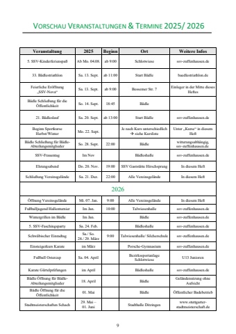 9HUDQVWDOWXQJ%u0003 %u0015%u0013%u0015%u0018%u0003 %HJLQQ%u0003 2UW%u0003 :HLWHUH%u0003,QIRV%u00035. SSV-Kinderferienspa%u00df Ab Mo. 04.08. ab 9:00 Schlotwiese ssv-zuffenhausen.de 33. B%u00e4dlestriathlon Sa. 13. Sept. ab 11:00 Start B%u00e4dle baedlestriathlon.de Feierliche Er%u00f6ffnung %u201eSSV-Nova%u201c Sa. 13. Sept. ab 9:00 Bessemer Str. 7 Einleger in der Mitte dieses Heftes B%u00e4dle Schlie%u00dfung f%u00fcr die %u00d6ffentlichkeit So. 14. Sept. 18:45 B%u00e4dle 21. B%u00e4dleslauf Sa. 20. Sept. ab 13:00 Start B%u00e4dle ssv-zuffenhausen.de Beginn Sportkurse Herbst/Winter Mo. 22. Sept. Je nach Kurs unterschiedlich %u00c6 siehe Kursliste Unter %u201eKurse%u201c in diesem Heft B%u00e4dle Schlie%u00dfung f%u00fcr B%u00e4dleAbteilungsmitglieder So. 28. Sept. 22:00 B%u00e4dle witterungsabh%u00e4ngig, ssv-zuffenhausen.de SSV-Frauentag Im Nov B%u00e4dleshalle ssv-zuffenhausen.de Ehrungsabend Do. 20. Nov. 19:00 SSV Gastst%u00e4tte Hirschsprung In diesem Heft Schlie%u00dfung Vereinsgel%u00e4nde Sa. 21. Dez. 22:00 Alle Vereinsgel%u00e4nde In diesem Heft 2026 %u00d6ffnung Vereinsgel%u00e4nde Mi. 07. Jan. 9:00 Alle Vereinsgel%u00e4nde In diesem Heft Fu%u00dfballjugend Hallenturnier Im Jan. 10:00 Talwiesenhalle ssv-zuffenhausen.de Wintergrillen im B%u00e4dle Im Jan. B%u00e4dle ssv-zuffenhausen.de 5. SSV-Faschingsparty Sa. 24. Feb. B%u00e4dleshalle ssv-zuffenhausen.de Schw%u00e4bischer Einradtag Sa./ So. 28./ 29. M%u00e4rz 9:00 Talwiesenhalle/ Silcherschule ssv-zuffenhausen.de Einsteigerkurs Karate im M%u00e4rz Porsche-Gymnasium ssv-zuffenhausen.de Fu%u00dfball Ostercup Sa. 04. April Bezirkssportanlage Schlotwiese U13 Junioren Karate G%u00fcrtelpr%u00fcfungen im April B%u00e4dleshalle ssv-zuffenhausen.de B%u00e4dle %u00d6ffnung f%u00fcr B%u00e4dleAbteilungsmitglieder 18. April B%u00e4dle Gel%u00e4ndenutzung ohne Aufsicht B%u00e4dle %u00d6ffnung f%u00fcr die %u00d6ffentlichkeit 01. Mai B%u00e4dle %u00d6ffentlicher Badebetrieb Stadtmeisterschaften Schach 29. Mai %u2013 01. Juni Stadthalle Ditzingen www.stuttgarterstadtmeisterschaft.de VORSCHAU VERANSTALTUNGEN & TERMINE 2025/ 2026 9